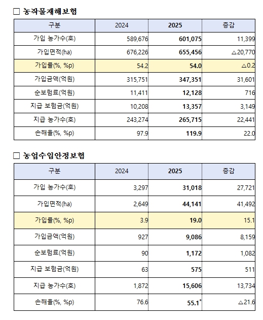 | ▲ 2025년 농작물보험 주요 운영실적 |