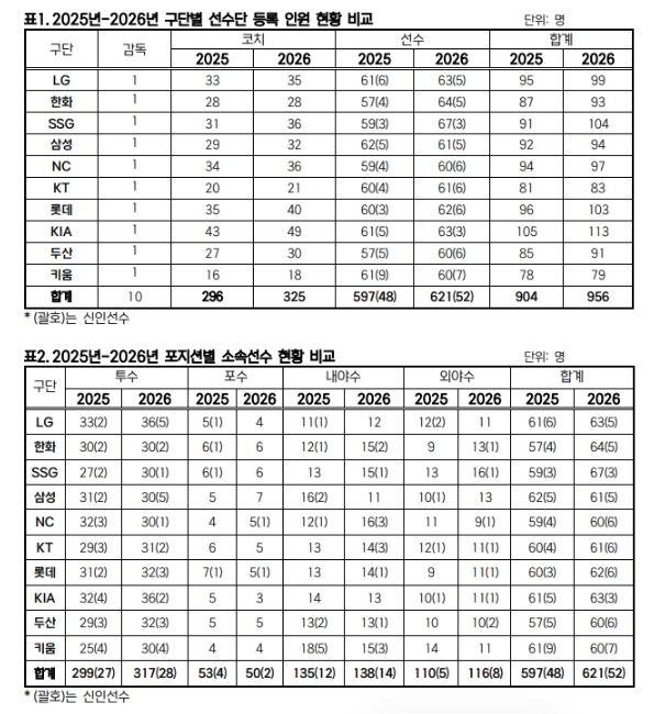 [뉴스서울] KBO는 2월 10일(화) 2026년 KBO 리그 소속 선수 명단을 공시했다. 10개 구단은 총 621명의 선수를 등록해, 597명이 등록했던 2025년보다 24명이 늘어났다.