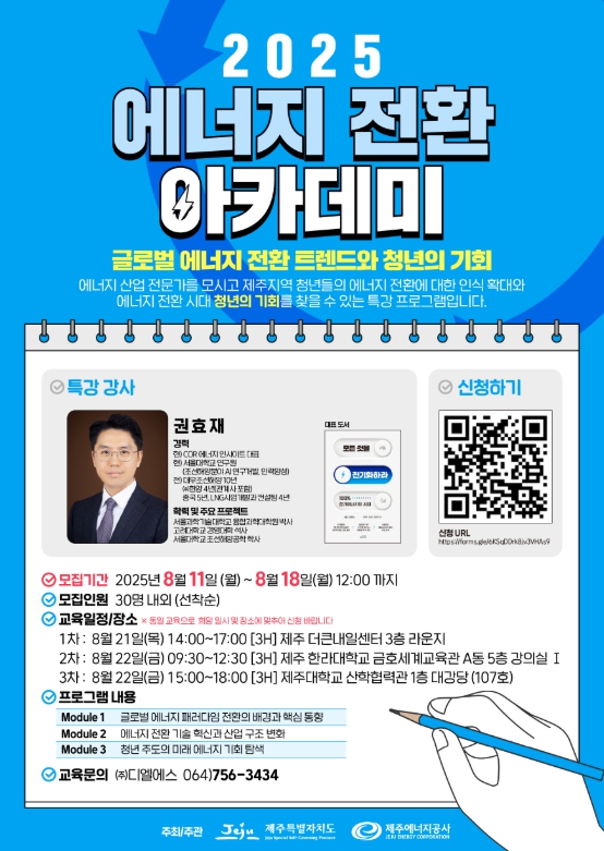 교육은 8월 21일(목)과 22일(금) 양일간 총 3회에 걸쳐 진행되며, 에너지 시장 전문가인 COR 에너지 인사이트 권효재 대표가 강사로 나서 ʹ글로벌 에너지 전환 트렌드와 청년의 기회ʹ를 주제로 강연을 펼친다. 세계적인 에너지 패러다임의 변화 속에서 청년이 나아갈 방향과 도전 기회를 공유할 예정이다.