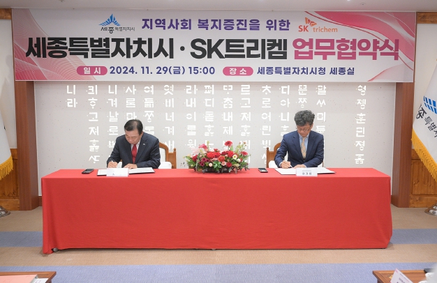 [뉴스서울] 세종특별자치시가 29일 오후 3시 시청 5층 세종실에서 SK트리켐와 경로당 수리지원 등 사회공헌활동 활성화를 위한 업무협약을 체결했다.