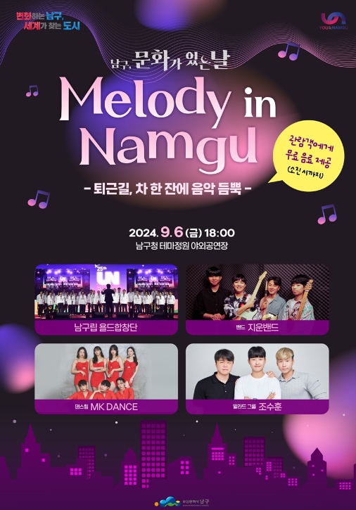 [뉴스서울] 부산 남구는 오는 9월 6일 저녁 6시 남구청 테마정원 야외공연장에서 2024 남구 문화가 있는 날 ‘Melody in Namgu’를 개최한다.