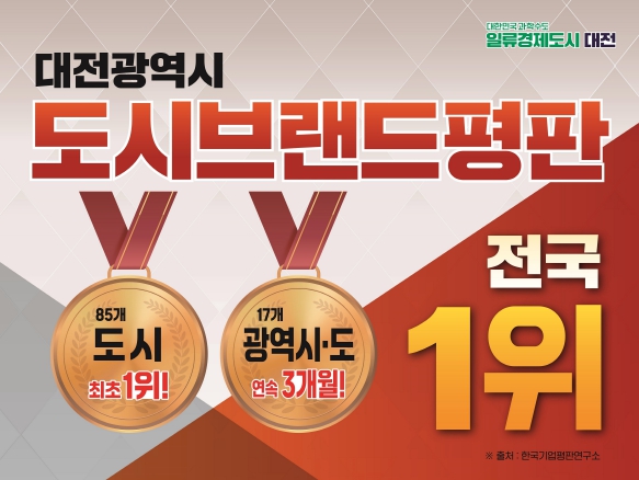 이는 대전시가 17개 광역자치단체 브랜드 평판에서 3개월 연속 1위를 기록한 데 이어, 대한민국 전체 도시브랜드 평판에서도 최고 자리에 오른 쾌거이다.