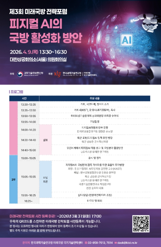 [뉴스서울] 과학기술정보통신부는 한국과학기술연구원(원장 오상록)과 함께 4월 9일 대한상공회의소에서 제3회 미래 국방 전략 토론회(전략 포럼)(‘물리적 인공지능'피지컬AI'의 국방 활성화 방안’)을 개최했다고 밝혔다.