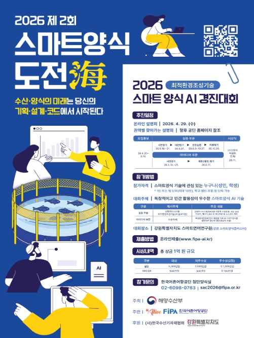 [뉴스서울] 해양수산부와 한국어촌어항공단(이사장 홍종욱)은 4월 20일부터 5월 15일까지 ‘제2회 스마트양식 도전해(海) 경진대회’의 공모를 실시한다고 밝혔다.