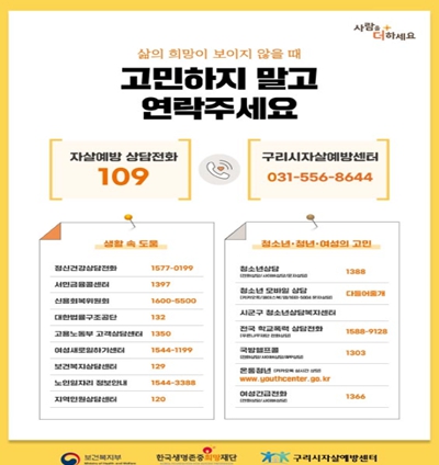 이에, 구리시 정신건강복지센터 부속시설인 구리시 자살예방센터는 ▲‘정신건강 상담전화 109’ 현수막 게시 ▲관공서, 공동주택, 병원 등에 ‘자살 관련 도움 기관 정보’ 전단지, 포스터 배포 ▲아파트 관리비 고지서 내 자살 예방 상담 안내 광고 게재 ▲자살 고위험군에 안부 문자 발송 등 자살 예방을 위해 적극 노력하고 있다.