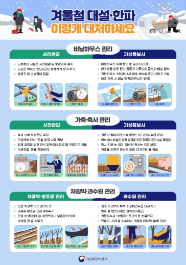 농식품부는 농업재해대책상황실을 중심으로 기상 상황을 면밀히 모니터링하고, 대설·한파 등 특보 발령 시 지자체, 농진청, 농협 등 관계기관에 “농업시설 관리 철저 및 비상근무 실시” 등을 긴급 지시하는 한편, 피해 우려지역의 농업인을 대상으로 사전대비 및 대설·한파 특보 발령 시 단계별 피해 예방 요령을 문자와 자막방송, 마을 방송 등을 통해 긴급 전파할 계획이다.