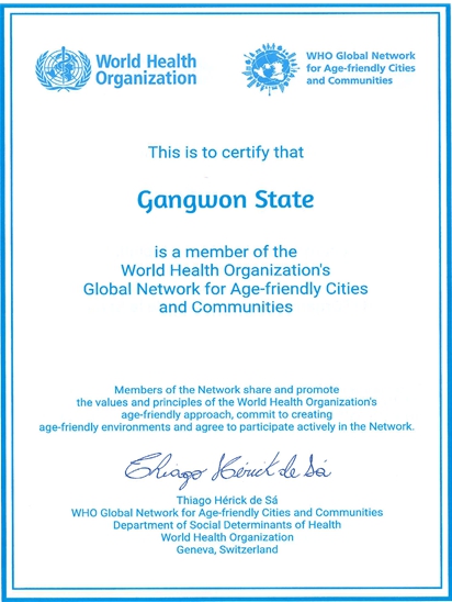 [뉴스서울] 강원특별자치도가 노인이 건강하고 활력있는 사회생활을 영위할 수 있도록 관련 인프라를 조성해 온 노력을 인정받아,시군이 있는 광역도 단위 최초로 세계보건기구(WHO)로부터 ‘고령친화도시 국제네트워크’ 가입 인증(3.17.)을 받았다고 밝혔다.