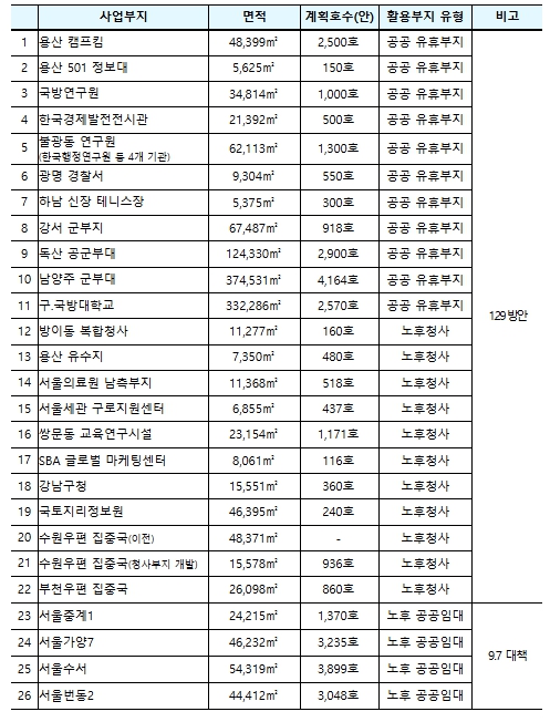 | ▲ 도심 유휴부지, 노후시설 활용 공공주택 사업 목록(26개) |
