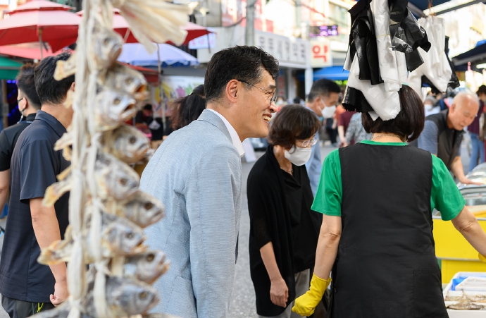 ▲ 지난 추석, 전통시장을 찾아 상인과 대화하는 이기재 양천구청장