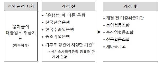 이번 개정안은 재생에너지 정책융자 취급기관(현재 15개 기관)에 지역과 밀접한 4개 금융기관 추가를 주요 내용으로 하고 있다.