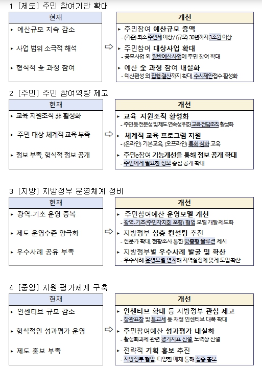▲3조원 이상 예산 증액 등 주민 참여 기반 확대 ▲교육 강화 등 주민 참여역량 제고 ▲주민자치회 연계 등 광역-기초 협업 강화 ▲중앙정부 평가 및 지원의 선순환 체계 구축
