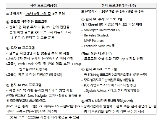 둘째, 선정된 기업에게는 글로벌 진출에 필요한 약 8,000만 원의 진출 자금과 미국에서 진행하는 5주 가량의 현지 프로그램(붙임2), AI 제품 및 서비스의 기술력을 검증하는 해외 실증(Proof of Concept), 최소 3회 이상의 현지 투자 IR(Investor Relations) 참여 기회 등이 주어진다.