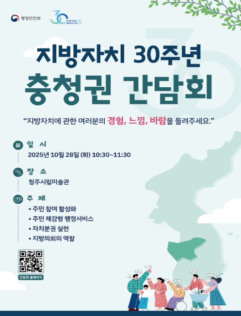 [뉴스서울] 행정안전부는 10월 28일 충청북도 청주시립미술관에서 민선 지방자치 30주년 충청권 간담회를 개최한다고 밝혔다.