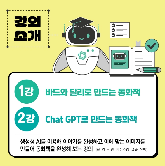 강의는 생성형AI를 이용해 동화책 등의 콘텐츠를 창작하거나 메타버스를 활용해 이야기 속 문제상황을 해결해 보는 방식으로, 바드와 달리로 만드는 동화책, 챗GPT로 만드는 동화책, 그림책과 함께하는 메타버스 놀이터, 생성형 AI를 이용한 콘텐츠 창작 등의 주제로 구성된다.