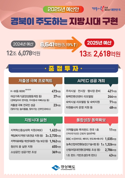 저출생 극복 프로젝트, APEC 성공 개최를 통한 경북 위상 강화, 1조 펀드 조성 등을 통한 민간투자 활성화, 경북이 주도하는 지방시대 실현, BBC+E(배터리, 바이오, 반도체+에너지) 등 미래성장동력 확충 등 핵심과제에 집중적으로 투자해 경북이 다시 한번 대한민국 성장의 중심이 될 수 있는 마중물 예산안을 편성했다.