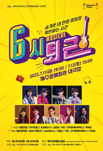 [뉴스서울] 제주특별자치도 문화예술진흥원은 젊은 관객층을 위한 기획공연으로 대학로에서 2018년부터 2025년까지 공연되며 많은 사랑을 받아 온 뮤지컬 '6시 퇴근'을 , 오는 7월 11일부터 12일까지 문예회관 대극장에서 양일간 공연을 무대에 올린다.