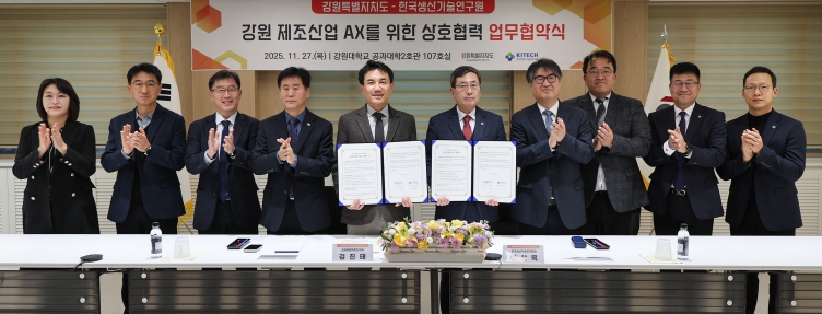 [뉴스서울] 강원특별자치도는 11월 27일 오후 3시, 강원 제조산업의 AX(AI Transformation, 인공지능 전환)를 위한 상호 협력을 강화하기 위해 한국생산기술연구원(원장 이상목)과 업무협약(MOU)을 체결했다.