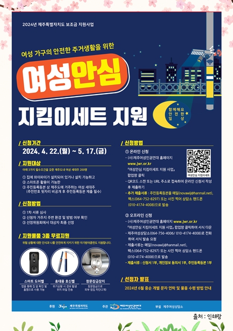 여성 안심 지킴이세트 지원을 원하는 여성은 4월 22일부터 5월 17일까지 ㈔제주여성인권연대 제주여성상담소로 신청서를 제출하면 된다.