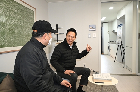▲ 오세훈 서울시장이 10일(월) '노후 공공임대 품질개선' 첫 단지인 홍제 유원하나 아파트의 재입주 주민과 대화하고 있다.