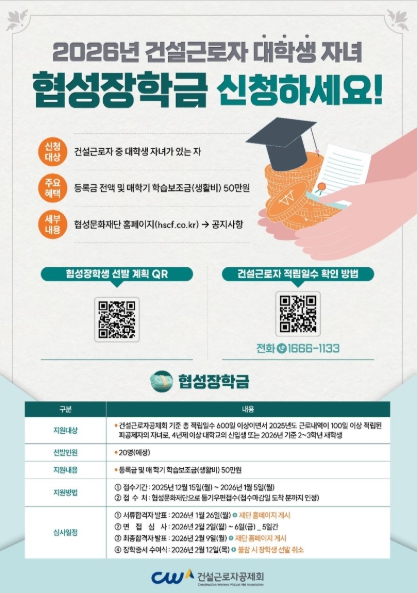▲ [포스터] 2026년 건설근로자 대학생 자녀 협성장학금
