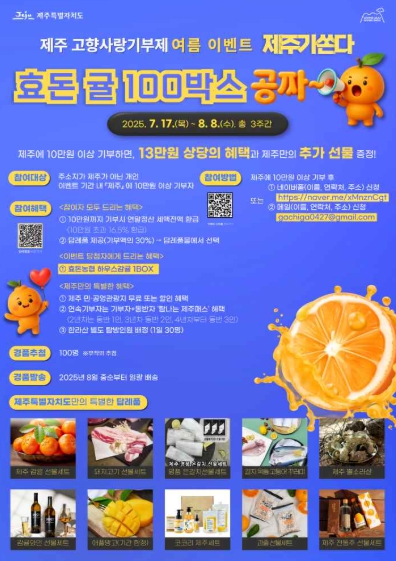 [뉴스서울] 제주특별자치도는 고향사랑기부제 활성화를 위해 ‘제주가 쏜다. 효돈 귤 100박스 공짜~’여름 이벤트를 실시한다고 밝혔다.