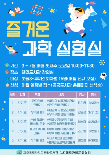 [뉴스서울] 제주특별자치도 한라도서관은 오는 3월부터 7월까지 매월 첫째 주 토요일 초등학생을 대상으로 기초과학 체험 프로그램 ‘즐거운 과학 실험실’을 운영한다.