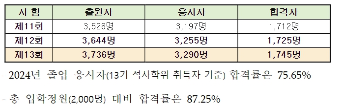 「변호사시험 관리위원회」는 직전 회의(’23. 11. 1.)에서 정한 ‘응시인원, 동점자 등을 고려하여 1,730명 내외’라는 합격 기준과 점수 분포(격차), 최근 합격률 등을 종합적으로 고려하여 1,745명을 합격인원으로 심의‧의결했다.