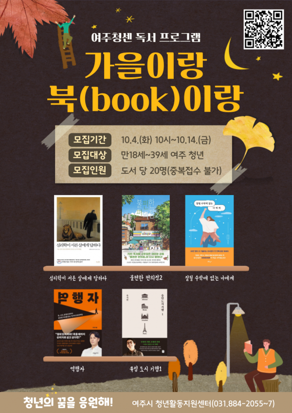 여주시 청년활동지원센터 관계자는 “청년들에게 독서의 계절 가을을 책과 함께 즐길 수 있도록 심리·소설·에세이·자기계발·인문 등 다섯 분야의 도서를 선정했다 취향에 따른 맞춤 독서가 가능한 이번 프로그램을 통해 따뜻한 위로와 응원, 재충전의 시간을 갖게 되길 바란다”고 말했다.