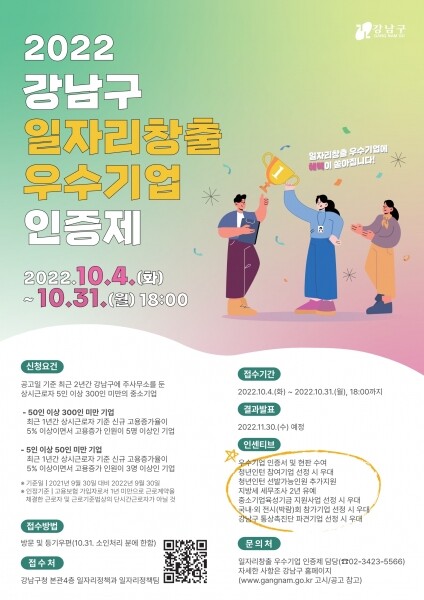 신청 자격은 최근 2년간 강남구에 주사무소를 둔 중소기업 중 지난해 9월 30일부터 올해 9월 30일 사이에 고용증가율이 5% 이상이고 고용 인원이 3명 이상 5명 이상 증가한 곳이다.