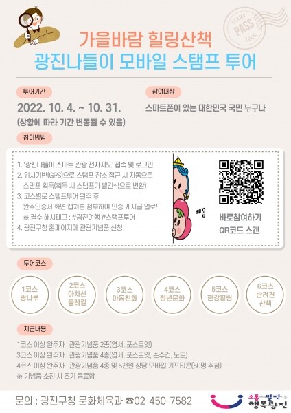 국민 누구나 참여 가능한 이번 광진나들이 모바일 스탬프 투어는 10월 4일부터 31일까지 진행되며 기념품 지급은 관광기념품 소진 시 조기 종료될 수 있다.