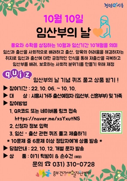 많은 시민의 참여를 유도하기 위해 참여자 100명에게 상품을 제공하며 시흥시에 거주하는 출산 예정자 및 가족은 모두 참여할 수 있다.