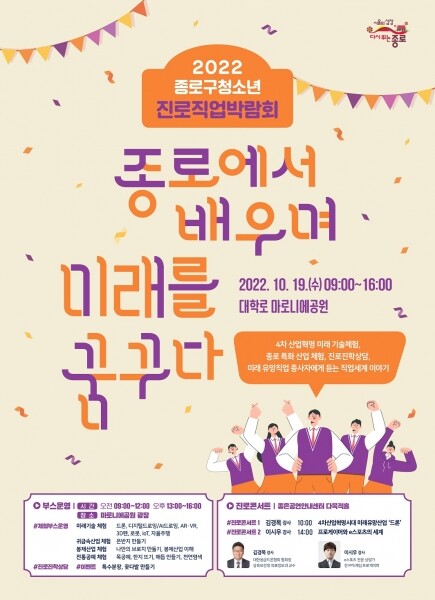 한편 종로구 청소년 진로직업박람회는 코로나19 장기화로 그간 온라인에서 개최하다 올해 대면 행사로 기획함에 따라 사전에 9개 중학교 1,300여명이 참여 의사를 밝히며 뜨거운 관심을 보이고 있다.