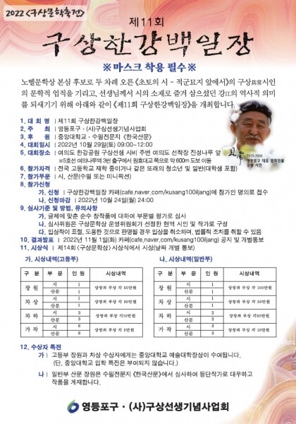 문학에 관심 있는 전국 고등학교 재학생과 또래 청소년, 대학생을 포함한 일반인 누구나 참가할 수 있으며 10월 24일 24시까지 구상한강백일장 네이버 카페를 통해 신청하면 된다.