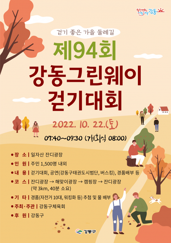 강동구가 후원하고 강동구체육회가 주관해 열리는 이 행사는 ‘걷기 좋은 가을 둘레길’을 테마로 이른 아침 단풍이 어우러진 그린웨이 둘레길을 구민과 함께 걸으며 건강한 걷기 문화를 조성하고 이웃 간 소통의 장을 제공하고자 마련됐다.