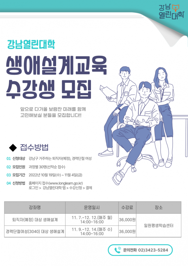 각 과정별 30명씩 선착순 모집하고 있으며 수업을 듣기 원하는 사람은 11월 4일까지 ‘강남평생학습 홈페이지’에서 온라인 접수할 수 있다.