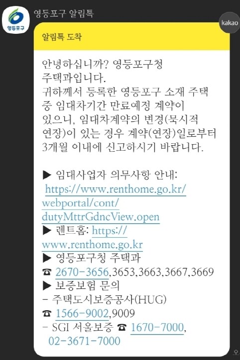 영등포구가 전국 최초로 관내 24,918호 등록 민간 임대주택사업자를 대상으로 임대차계약 만기 3개월 전 신고 의무를 안내하는 ‘카카오톡 알림톡’ 서비스를 실시했으며 10월 26일에 해당 대상자에게 2,600여 건의 알림톡을 발송했다고 밝혔다.