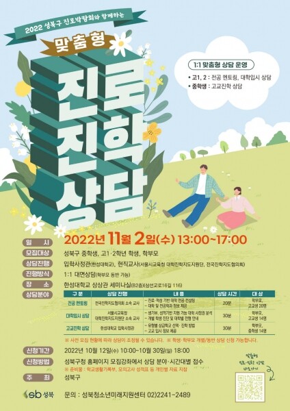 이번 맞춤형 진로진학 상담은 11월 2일 오후 1시~오후 5시 한성대학교 상상관 세미나실에서 진행되며 성북구청 홈페이지 ‘온라인 강좌 신청’에서 10월 30일 오후 6시까지 상담 분야별, 시간대별로 접수할 수 있다.
