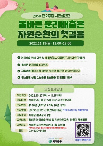 이달 19일 오후 1시부터 5시까지 서대문 두바퀴환경센터에서 분리배출 방법 교육, 새 활용을 통한 ‘나만의 숲’ 만들기, 분리배출 OX퀴즈, 재활용품 수거 등으로 진행된다.