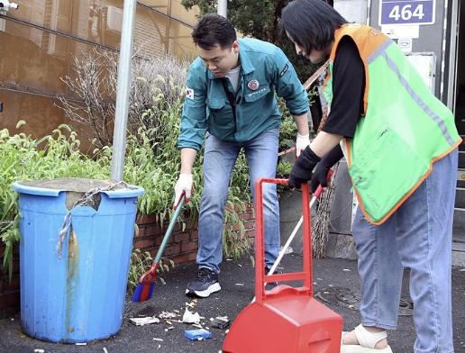 ▲ 오언석 도봉구청장이 길거리 버려진 담배꽁초 등 쓰레기를 청소하고 있다 |