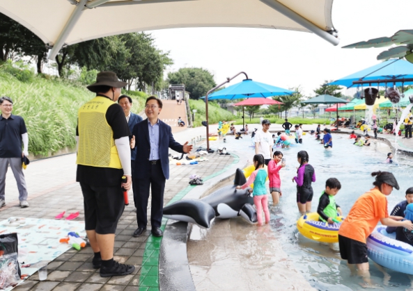 ▲ 지난해 유성훈 구청장이 물놀이장을 방문해 자원봉사자를 격려하고 있다 |