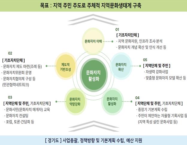 사업 첫해 추진 시군은 ‘문화자치 이해’ 또는 ‘문화자치 제도적 기반 조성’을 필수적으로 시행해야 하며, 2~3년 차 시군은 ‘문화자치 활성화’, 4년 차 시군은 ‘문화자치 확산’이 필수 추진 항목이다.