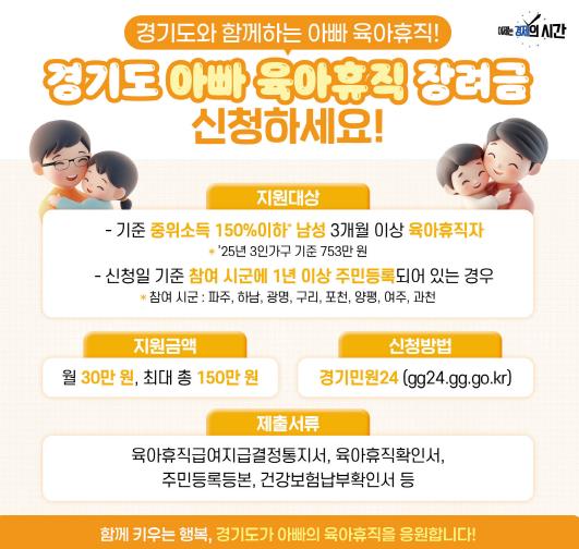 [뉴스서울] 경기도가 올해부터 ‘경기도 아빠 육아휴직 장려금 지원’ 사업을 하남, 광명, 양평, 여주, 파주, 구리, 포천, 과천 등 도내 8개 시군에서 시행한다.