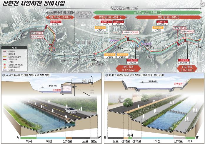 신현천 하천정비 사업은 광주시 능평동 용산교부터 오산천 합류부까지 총 2.44㎞ 구간에 제방을 정비하고, 호우 시 물 흐름에 지장을 주는 교량 5개를 철거 후 재설치해 치수능력과 안전성을 강화하는 사업이다.