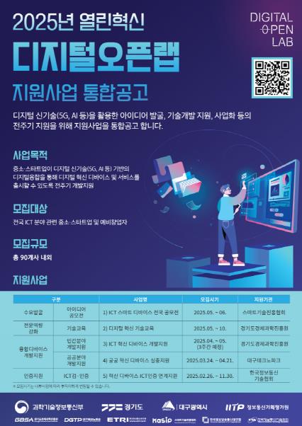[뉴스서울] 경기도는 1일 ‘2025 열린 혁신 디지털 오픈랩’ 지원사업 통합 공고를 발표하고, 참여기업 모집에 나섰다. 5G, 인공지능(AI) 등 첨단 기술을 활용해 혁신적인 디바이스와 서비스를 개발하는 중소기업과 스타트업을 대상으로, 제품 개발부터 사업화까지 전 과정을 지원한다.