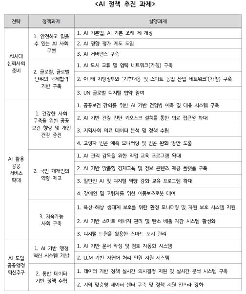 이에 연구원은 AI 일상화 시대의 정책 목표로 ▲‘다양한 개인의 삶이 존중되는 건강 사회 구현’과 ▲‘모두의 디지털 접근성이 보장되는 디지털 포용 사회 구현’을 제시했으며, 이를 위해 3대 추진전략(▲AI 시대 신뢰 사회 준비 ▲AI 활용 공공 서비스 확대 ▲AI 도입 공공 행정 혁신 추구) 및 7개 정책과제에 따른 21개 실행 과제를 제안했다.