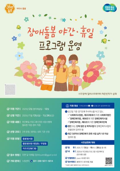 [뉴스서울] 경기도는 대표 복지정책인 ‘경기 360° 돌봄’의 하나로 야간․휴일에도 장애인과 그 가족을 대상으로 돌봄프로그램을 제공하는 ‘360° 어디나 돌봄 장애돌봄 야간․휴일 프로그램’사업 운영기관을 1월 13일부터 24일까지 모집한다.