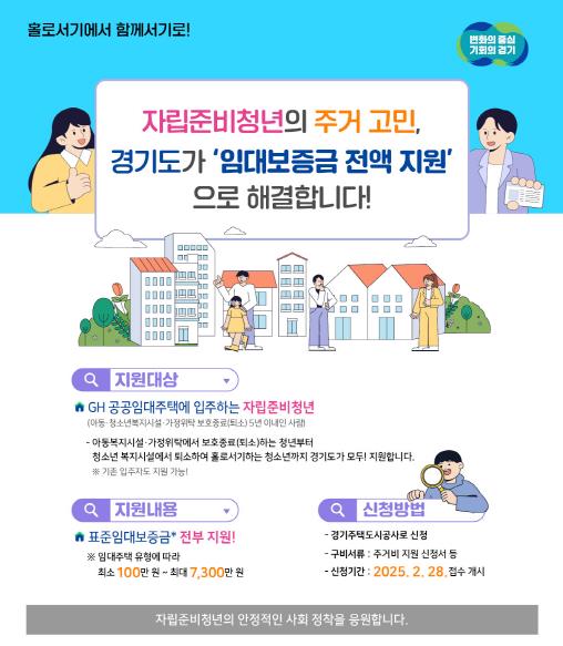 [뉴스서울] 경기도가 전국 최초로 경기주택도시공사(GH) 공공임대주택에 거주하는 자립준비청년에게 최대 8년 동안 임대보증금 전액(도비 100%)을 지원하는 ‘자립준비청년 주거비 지원사업’을 시행한다.