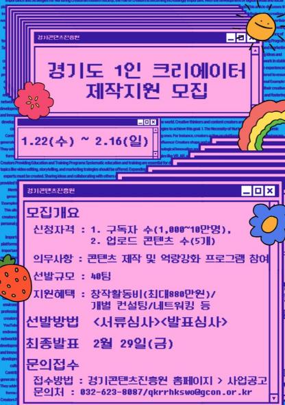 2017년부터 시작된 경기도 1인 크리에이터 지원 사업은 경기도를 기반으로 활동하는 구독자 1천 명 이상 10만 명 이하 채널을 보유한 크리에이터를 대상으로 한다. 최근 3개월간 직접 기획·제작해 게시 완료한 동영상 콘텐츠가 5개 이상이면 신청할 수 있다.