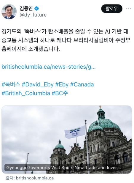 캐나다 브리티시컬럼비아(이하 BC)주는 2024년 7월 30일 주 홈페이지에 김동연 지사의 BC주 방문 소식을 전하면서 똑버스를 "실시간으로 경로를 최적화하고 특히 서비스가 부족한 지역의 대중교통 비효율성을 해결하는 혁신적인 대중교통 솔루션"이라고 소개하며 높은 관심을 보였다.