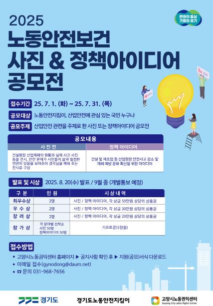 경기도가 주최하고 고양시노동권익센터가 주관하는 이번 공모전은 산업현장 재해 예방의 중요성을 널리 알리고, 시민·노동자·관리자 등 다양한 시각에서 나온 창의적인 정책 아이디어를 통해 실질적인 안전 문화 확산을 도모하기 위해 마련됐다.